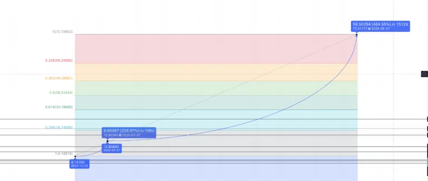 이 경로로 간다면 다음 고점은 9.52달러가 될 수 있으며, 이는 2024년의 고점으로 나타난다. 가장 낮은 하락률을 사용했을 때 이 지점에서 저점은 4.14달러로 표면화된다. 이 저점에서 209.66% 상승하면 2025년 고점인 12.80달러가 된다.