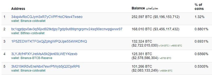 아래 이미지와 같이 잔고가 가장 높은 상위 5개 지갑 중 3개가 바이낸스에 속한다. 하지만 바이낸스가 보유한 코인의 상당수가 실제로 거래소에 예치된 사용자 자금이기 때문에 그것이 반드시 가장 많은 비트코인을 소유하고 있다는 것을 뜻하지는 않는다.