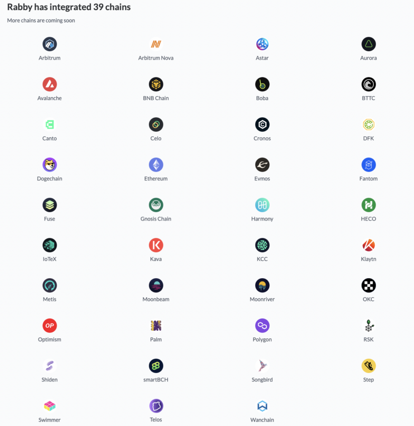래비 지갑의 가장 좋은 점은 이더리움 가상 머신 및 관련 디앱과 호환되는 모든 EVM 체인을 지원한다는 것이다. 래비는 블록체인에서 다음과 같이 확산되어 있다.