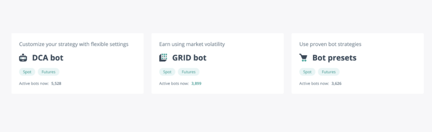 3Commas는 암호화폐 트레이딩 봇 애그리게이터에 가깝기 때문에 트레이딩 전략의 다양한 측면을 자동화할 수 있습니다. 예를 들어, 달러 비용 평균화 봇을 사용하면 달러 기준으로 정해진 금액의 암호화폐를 일정한 간격으로 매수할 수 있습니다. 3Commas는 그리드 또는 레벨 기반 거래용 봇, 반자동 스마트 트레이딩 실행을 위한 인터페이스, 단일 인터페이스에서 거래소별 거래 처리 등 다양한 기능도 제공합니다.