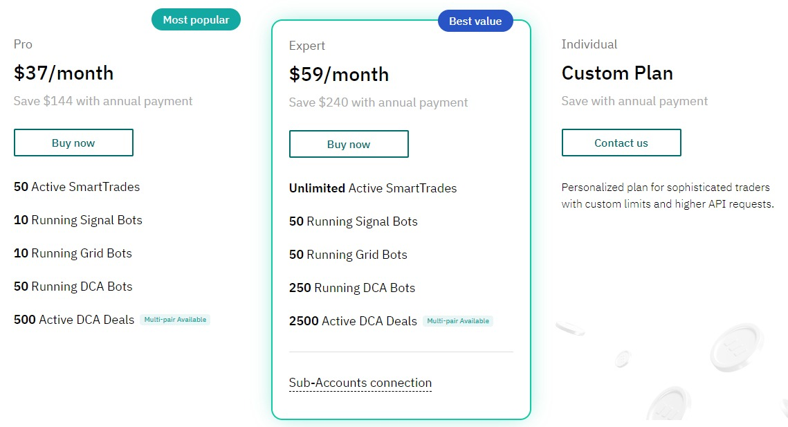3Commas의 요금제에는 연간 결제 기준 월 37 달러의 프로(Pro) 요금제와 월 59달러의 전문가 요금제가 있습니다.