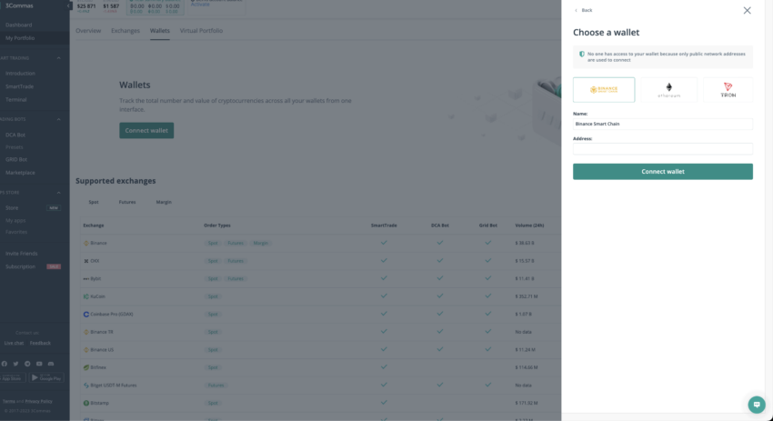 대부분의 거래를 중앙화거래소(CEX)에서 하는 트레이더라면 3Commas에 익숙해질 필요가 있습니다. 이 플랫폼을 사용하면 바이낸스, OKX와 같은 상위 플랫폼을 포함해 16개 거래소에서 봇을 이용한 거래가 가능합니다. 또한 개인 전자 지갑을 인터페이스에 연결할 수도 있어 거래소 바깥에서 보유 중인 자산을 관리하는데도 도움이 됩니다.