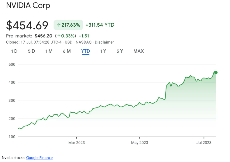 현재 많은 기업이 AI 분야에서 새로운 개발을 해나가고 있습니다. 기업 가치도 꾸준히 상승하고 있습니다. 2023년 5월, 엔비디아는 급증하는 수요를 충족하기 위해 AI 반도체 생산량을 늘릴 것이라고 발표한 바 있습니다. 아래 표에서도 볼 수 있듯이 엔비디아 주가는 계속 급등했습니다.