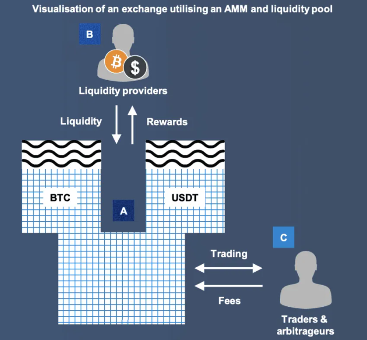 유동성 공급자는 특정 수량의 토큰을 제공하여 유동성 풀을 관리합니다. 또 자동화된 시장 조성자의 스마트 컨트랙트는 공급자에게 암호화폐 거래 수수료의 일부를 지급합니다.