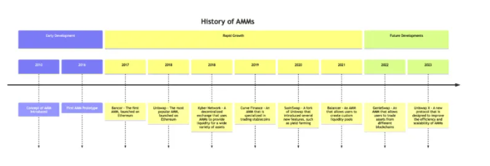 AMM은 2017년 뱅코르와 함께 공식적으로 등장했습니다. 하지만 2018년 유니스왑이 AMM을 대중화했습니다. 이더리움을 기반으로 구축된 유니스왑은 스마트 컨트랙트로 운영되며 시장 조성 과정을 자동화합니다. 2018년 이후 유동성 공급과 가격 탐색, 비영구적 손실과 같은 위험 처리와 관련하여 AMM 분야에서 상당한 발전이 있었습니다.