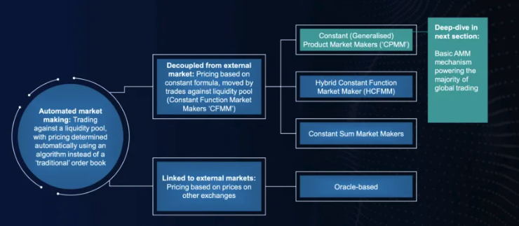 사람이 매매를 처리하는 기존 오더북과 달리 자동화된 시장 조성자(AMM)는 유동성 공급자와 탈중앙화 금융(DeFi) 사용자 등이 스마트 컨트랙트와 연계된 자동화된 거래를 지원합니다 .