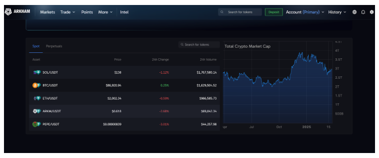 언뜻 보면, 아캄 익스체인지가 일반적인 거래 플랫폼처럼 보일 수 있습니다. 그러나 그 이면에는 훨씬 많은 기능이 있습니다. 이 플랫폼을 차별화하는 요소는 아캄 인텔 플랫폼(Arkham Intel platform)과 얼마나 밀접하게 연결되어 있는지에 있습니다.