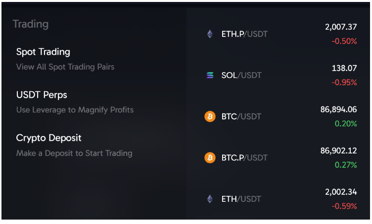 - 현물 및 영구 거래 지원: 현물을 거래하거나 USDT 기반 영구 거래에 참여할 수 있습니다.