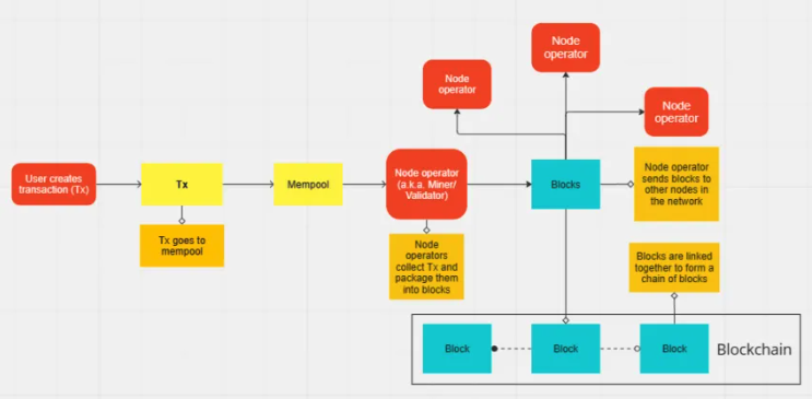 채굴자 또는 검증자라고 불리는 특수 작업자가 멤풀에서 이러한 트랜잭션을 수집하여 블록이라는 데이터 패키지에 넣습니다. 좀 더 자세히 설명하자면, 채굴자와 검증자는 노드를 실행하기 때문에 트랜잭션을 수락하고 처리하며 블록을 생성할 수 있습니다. 따라서 채굴자와 검증자라는 이름은 노드 운영자와 상호 교환할 수 있습니다.