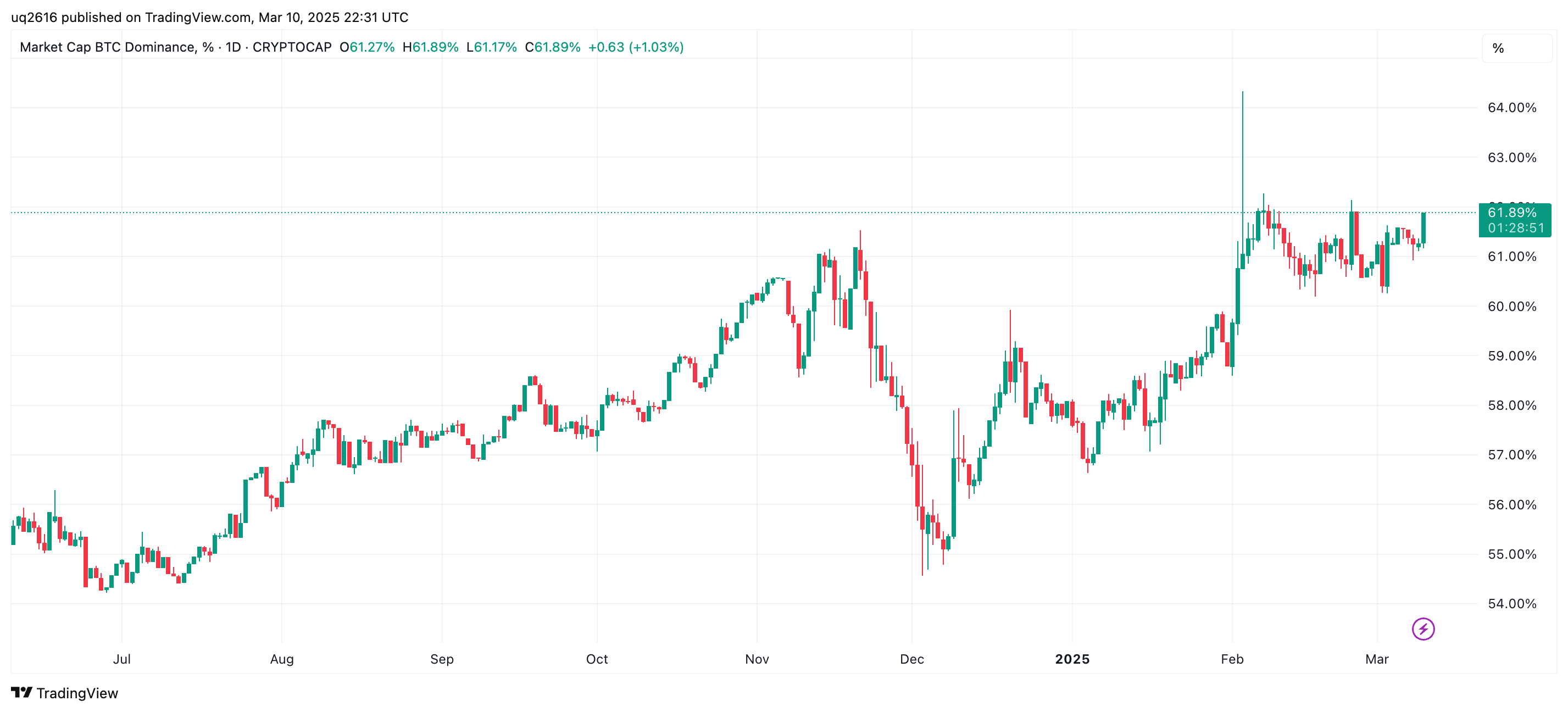 2025년 3월 11일 기준, 비트코인 도미넌스는 61.89입니다. 같은 시기, 미국이 주요 무역국에 관세를 매기기로 하면서 비트코인 가격이 잠시 8만 달러대가 무너졌습니다. 그럼에도 불구하고 비트코인 도미넌스는 상승했습니다. 비트코인이 10만 달러를 돌파했던 2024년 12월말보다 비트코인 도미넌스가 더 높습니다.