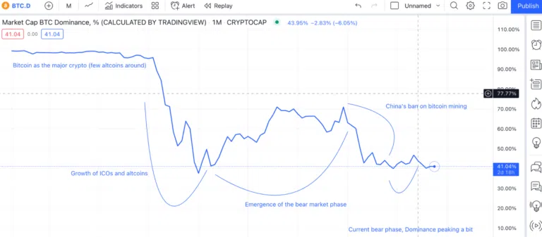 물론 강세장에서는 이와 정반대의 상황이 펼쳐집니다. 상승률이 높은 알트코인으로 자금이 빠져나가면서 비트코인 도미넌스가 하락할 수 있습니다.