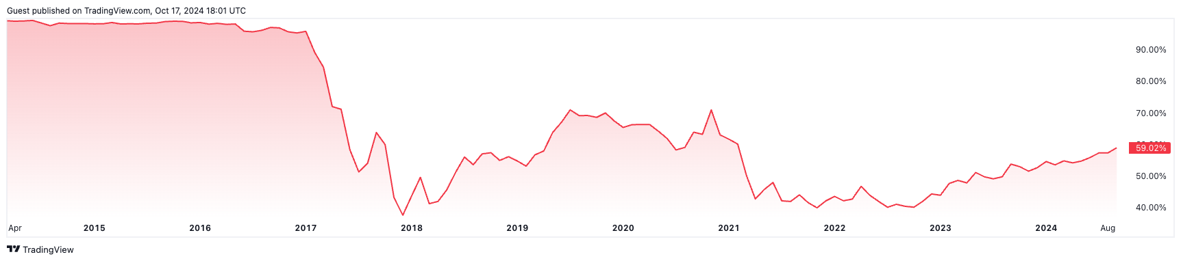 과거 비트코인 도미넌스는 2020-2021년 강세장에서 70% 이상 상승했습니다. 이후 2021년 중반에 42%까지 하락했습니다. 이후 비트코인 도미넌스는 1년 동안 40%~46%를 오르내리다가, 2022년 말 암호화폐 거래소인 FTX 붕괴 이후 다시 바닥 수준인 40%에 근접했습니다. 이후 꾸준한 우상향 곡선을 그리고 있습니다.