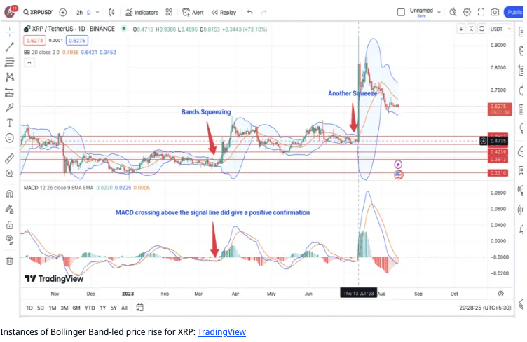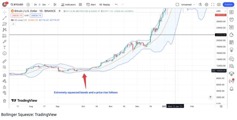 밴드가 함께 압박되어 시장이 통합된 모습을 보이면 지표가 잠재적 돌파를 암시할 수 있습니다. 하지만, 단기 트레이딩을 할 경우 이 지표에만 의존해서는 안 됩니다.