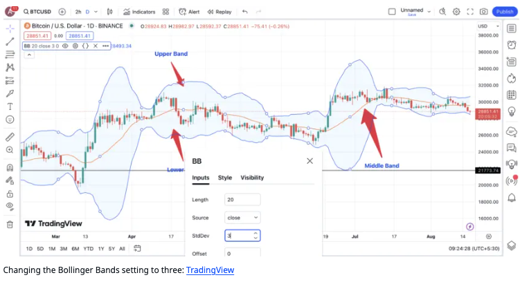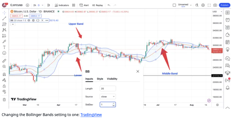 선택한 트레이딩 플랫폼에서 설정을 열어 표준 편차를 1 또는 3으로 변경할 수도 있습니다. 1은 데이터 포인트의 68%만 포함합니다. 즉, 표준편차 1 설정에 따른 상한 및 하한 밴드는 중간 밴드에 가까워집니다. 따라서 시장 시나리오에 따라 가격이 상한선과 하한선에 자주 닿게 되므로 더 많은 신호를 기대할 수 있습니다. 하지만 신호가 많을수록 신뢰도는 낮아집니다.
