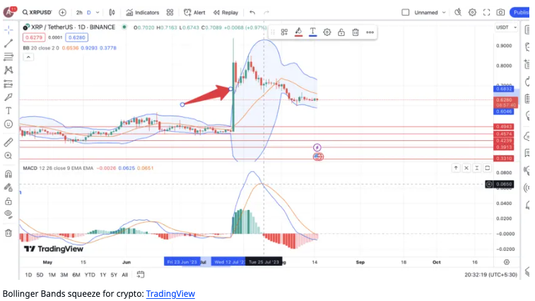 아래 리플(XRP) 차트를 보면 볼린저 밴드의 압박이 발생한 것을 볼 수 있습니다. 이를 통해 데이 트레이딩에서 볼린저 밴드를 사용하는 법을 알아보겠습니다.