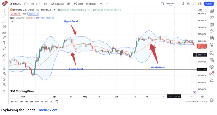 아래쪽 밴드는 위쪽 밴드의 모든 것을 갖추고 있지만 그 반대입니다. 이는 지지대 역할을 합니다. 아래를 교차하는 자산은 과매도 영역에 있는 것으로 간주됩니다. 중간 밴드는 20일 단순이동평균(SMA)입니다.