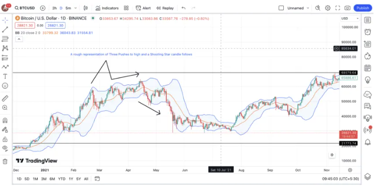 가격 패턴이 두 번 고점을 형성할 때입니다. 첫 번째 고점은 상단 밴드를 넘고 두 번째 고점은 간신히 상단 밴드에 도달할 경우, 가격이 조정될 것으로 예측할 수 있습니다.