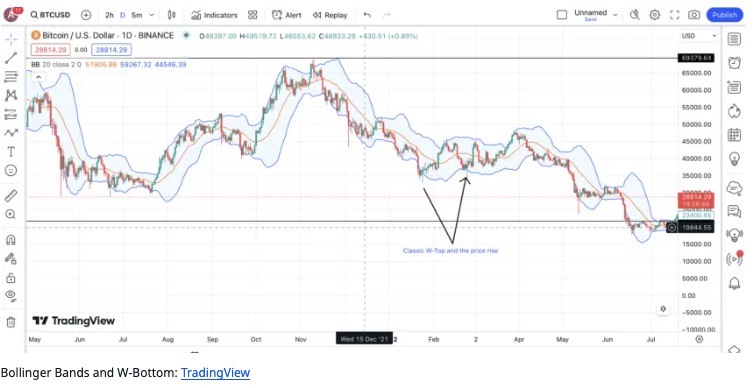 W-바닥은 첫 번째 최저가가 하한선 밴드에 닿거나 교차한 다음, 두 번째 저점에 간신히 닿는 것입니다. 이는 강한 상승 모멘텀을 나타내며, 하락세가 힘을 잃고 있다는 것을 말합니다.