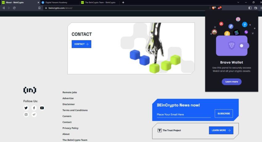 1.브레이브 브라우저로 가서 화면의 오른쪽 상단 모서리에 있는 지갑 기호를 클릭한다. 그런 다음 “Learn More”(자세히 보기)를 클릭한다.