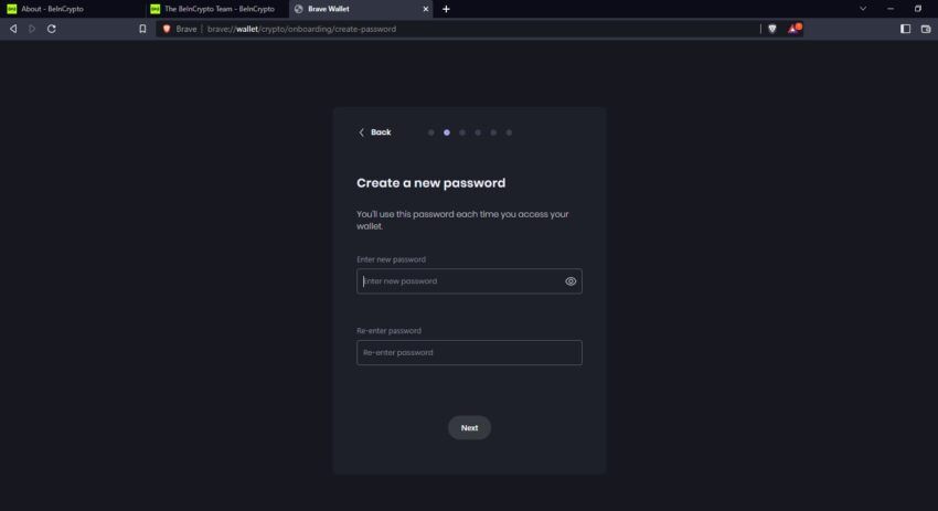 3. 다음 단계는 브레이브 월렛을 잠글 수 있는 새 비밀번호를 만드는 것다. 비밀번호를 입력하고 “Next”(다음)을 클릭한다.