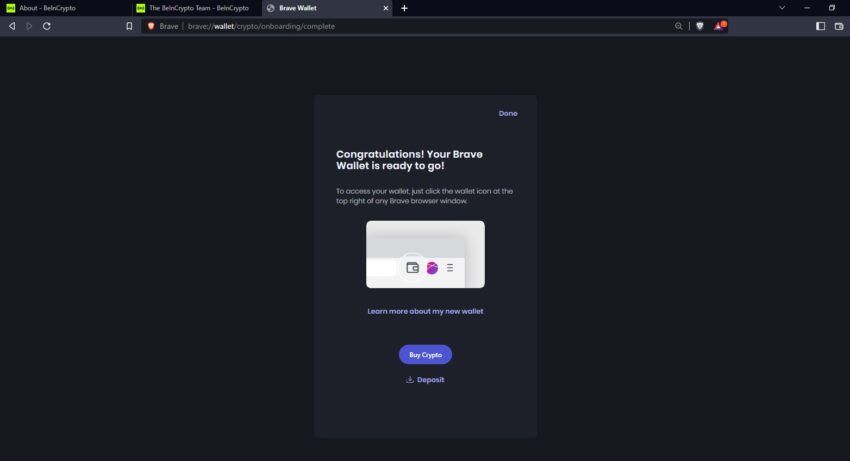 5. 이제 브레이브 월렛이 생성되었으며 암호화폐를 구매하거나 예치할 수 있다. 새 지갑 안에 넣으려면 “Done”(완료) 버튼을 누른다.
