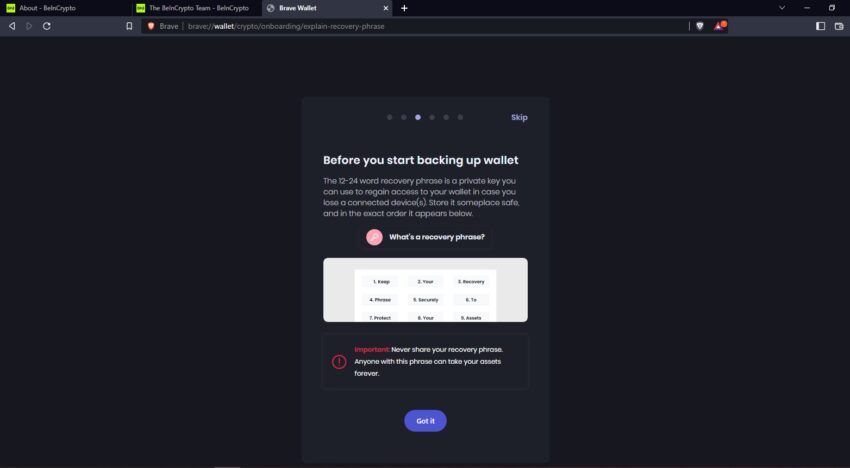 브레이브 월렛을 사용하려면 먼저 브레이브 브라우저를 다운로드해야 한다. 그 다음, 화면의 오른쪽 상단 모서리에 있는 “wallet icon”(지갑 아이콘)을 클릭하여 브레이브 월렛 계정을 만든다. 그리고 나서 새 비밀번호를 선택하고 복구/시드 구문을 저장하여 계정 설정을 계속한다.