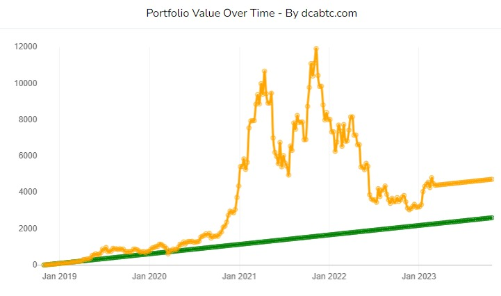 SponsoredDCA 계산기를 사용하면 80.41%의 수익률에 해당하는 3만 2942달러 규모가 된다. 원금(아래 그래프의 초록선)을 뺀 나머지가 수익이다. 아래 그래프에서 보듯이 2021년 하반기부터 2022년 상반기까지 급등기에는 수익폭이 훨씬 컸을 것이다. 확신이 있는 비트코인 투자자는 DCA 방식을 이어갈 것이므로, 앞으로도 큰 수익을 기대할 수 있다.