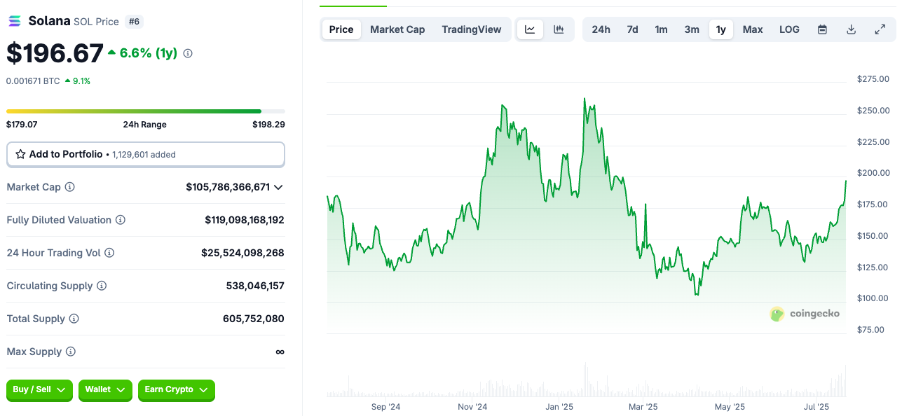 2025년 7월 22일 기준, 솔라나는 개당 196달러에 거래되고 있습니다. 이는 한 달 전에 비해 48% 상승한 가격입니다. 다만, 1년 전에 비해서는 7% 상승에 그쳤습니다.