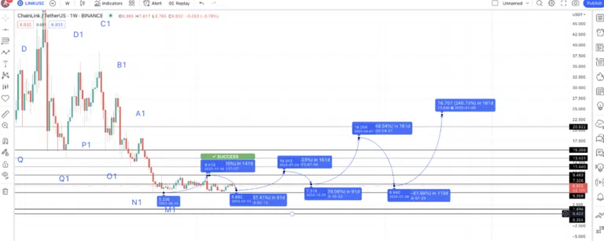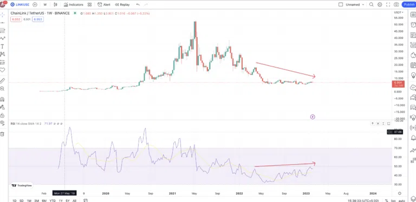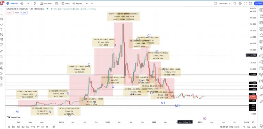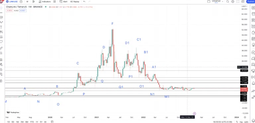 주별 RSI는 LINK의 가격이 A에서 F까지의 경로를 다시 추적하여 새로운 패턴을 시작할 수 있음을 나타낸다. 마지막으로 확인된 저점(M1)은 새로운 패턴에서 M이 될 수 있다. 다음 목표 또는 2023년 LINK의 최대 가격에서 새로운 추세(A2)가 시작될 수 있다.