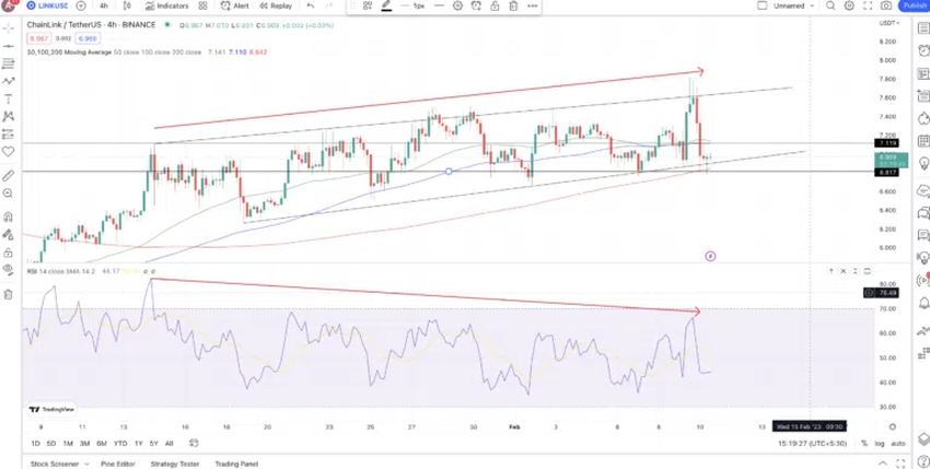 4시간 차트를 보면 뚜렷한 상승 쐐기(ascending wedge) 패턴이 나타난다. LINK 가격은 6.98달러로 상승 하한선에 매우 근접해서 거래되고 있다. 이 패턴을 깨고 하락할 경우 즉각적인 저항은 6.81달러에 도달할 수 있다.