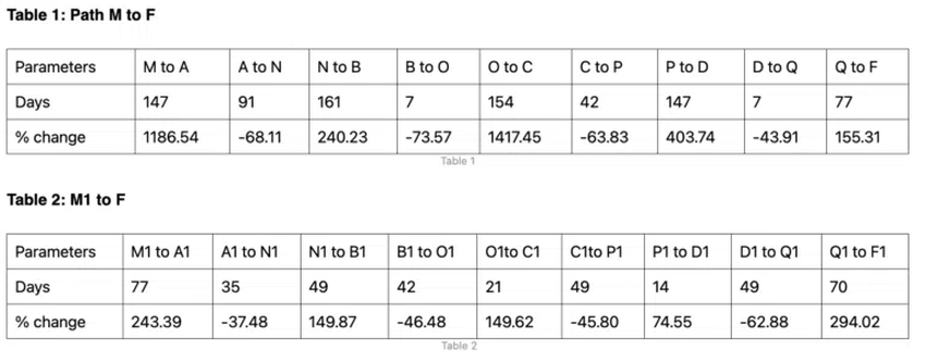 가장 먼저 해야 할 일은 A2의 위치를 찾는 것이다. 이를 위해 M에서 F까지의 두 경로와 M1에서 F까지의 두 경로에 해당하는 모든 지점 사이의 평균 가격 변화와 소요 예상 기간을 알아보자.