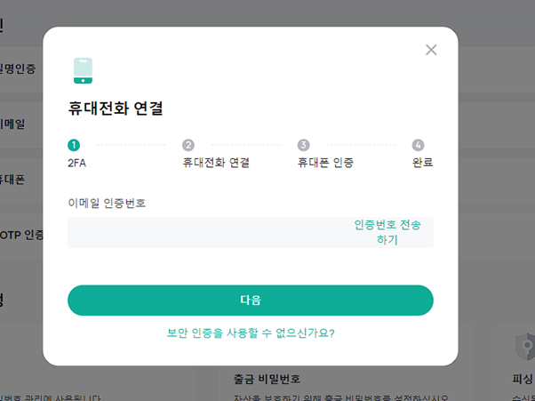 인증 절차를 더 진행하려면 먼저 개인 계정과 기관 계정 중 하나를 선택해야 한다. 개인 투자자라면 개인 계정을 선택하면 된다. 선택을 완료하면 보안 기능 기준 충족을 위해 휴대전화 번호를 인증해야 한다.