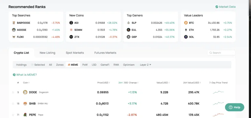 코인엑스에서 코인은 게임파이, 실물자산, 레이어2 토큰, 상위 상승 종목 등과 같은 분류에 따라 정렬된다.