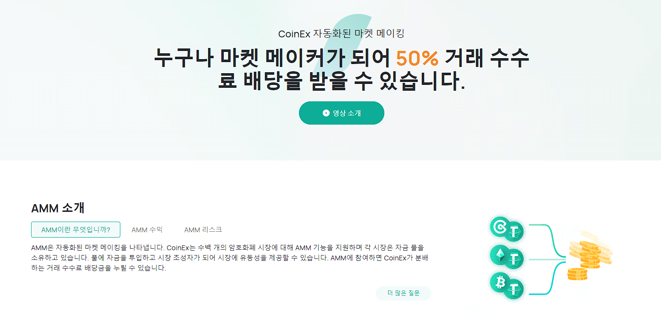 코인엑스에서는 특정 암호화폐에 대한 유동성을 제공하는 마켓 메이커(AMM)로 참여하여 수수료 배당을 통해 수동적 수익 옵션을 늘릴 수 있다. 코인엑스는 다양한 거래 쌍에 대한 AMM 생성 및 기능을 지원한다.