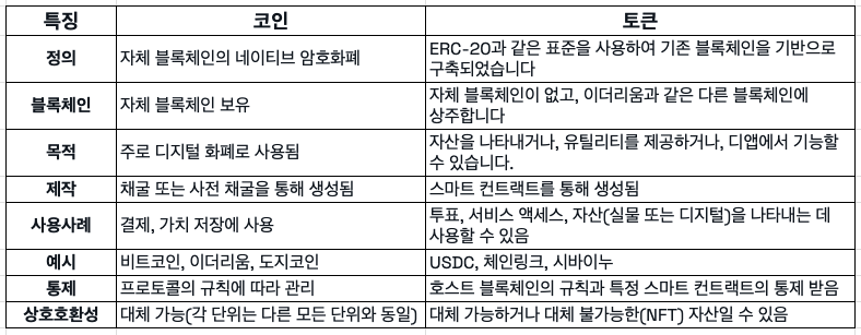 다음은 코인과 토큰의 주요 차이점을 간략하게 비교한 표입니다. 코인과 토큰의 차이점을 이해하는 데 도움이 될 것입니다.