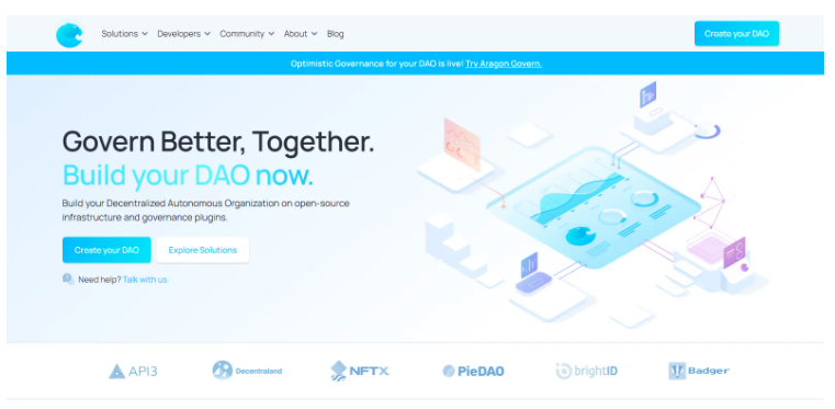 아라곤은 맞춤형 DAO를 만들기 위한 플랫폼입니다. 고급 프로그래밍 지식이 없는 사용자에게 매우 유용합니다. 아라곤은 스마트 컨트랙트 유형과 인터페이스를 관리하므로, 조직을 어떻게 관리할지는 사용자가 결정할 수 있습니다.