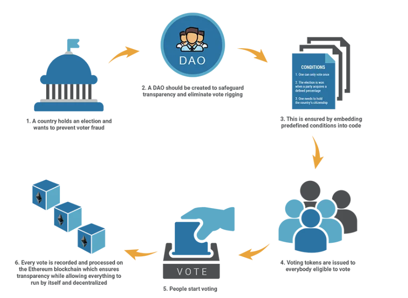그럼에도 불구하고 잘 설계된 스마트 컨트랙트를 통해 DAO는 조직이 기관을 투명하고 쉽게 관리할 수 있는 방법을 제시합니다. 이는 대부분의 구성원이 서로를 모르는 조직에서 더욱 그렇습니다. 이 시나리오는 사람들이 서로를 모르는 가장 큰 조직인 국가 단위에서 가장 잘 보여줍니다. 투표를 위한 블록체인 탈중앙화 자율 조직은 선거의 투명성과 정당성을 보호할 수 있으며, 이는 널리 받아들여지고 있습니다.