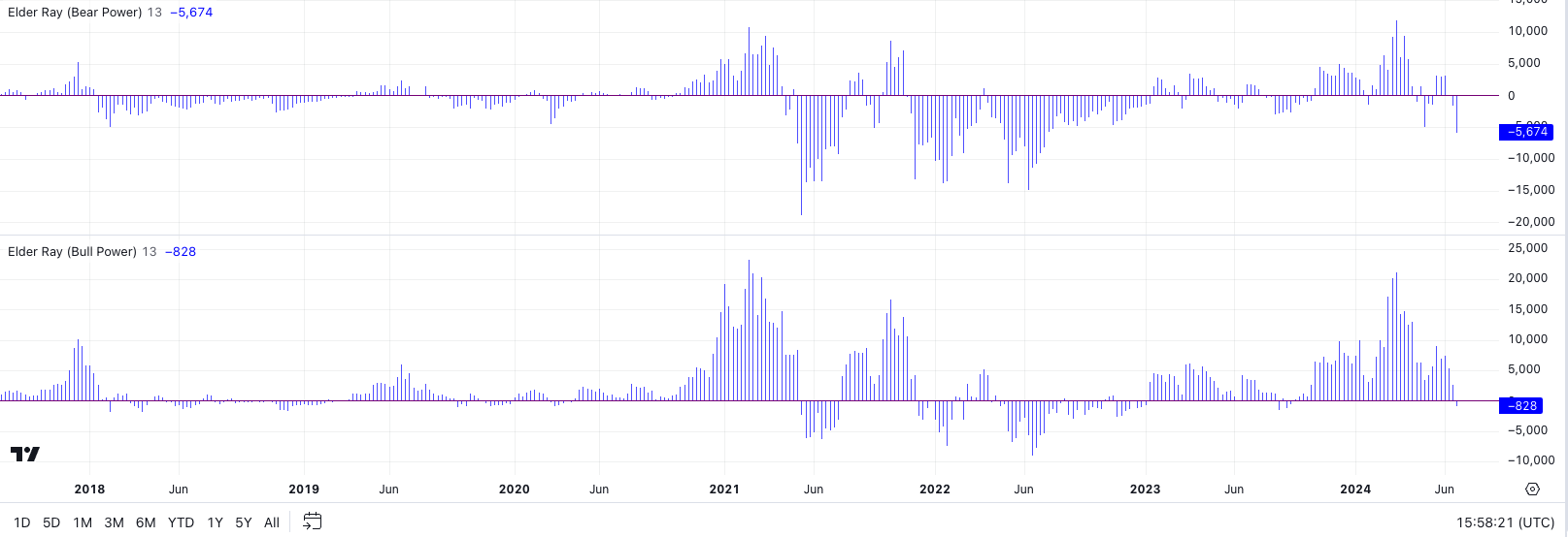 엘더 레이 지수는 강세 지수와 약세 지수 두 개로 표시됩니다. 하나는 상승 세력, 다른 하나는 하락 세력을 나타냅니다. 간단히 말해, 상승세와 하락세 중 어느 것이 우세한지 보여줍니다. 이를 통해, 투자자와 트레이더는 매수와 매도 시점을 포착할 수 있죠.