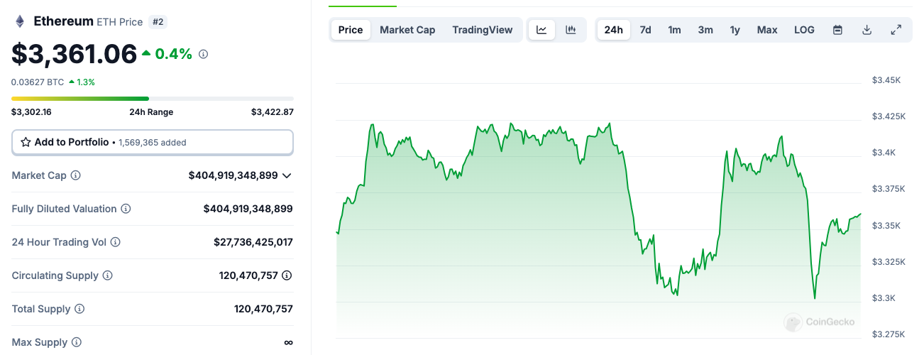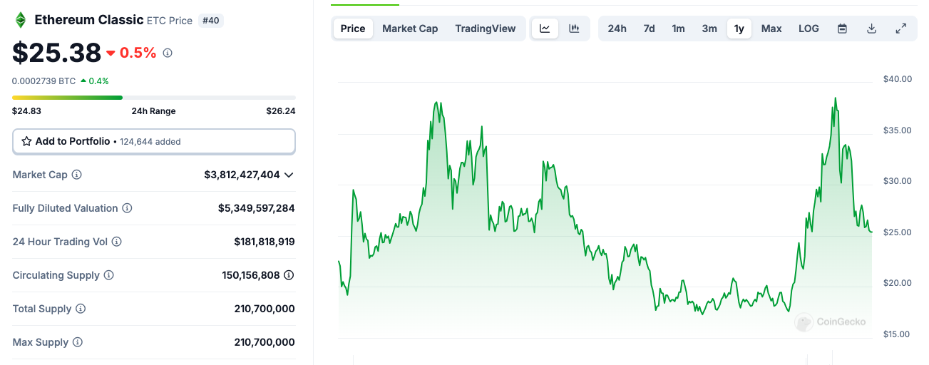 2024년 12월 31일 기준, 이더리움 가격은 3361달러입니다. 일년 전에 비해 46% 상승한 가격입니다. 반면 이더리움 클래식 가격은 1년 전에 비해 13.9% 상승한 25.38달러를 나타내고 있습니다.