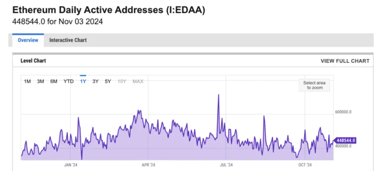 - 활성 주소 수(Active addresses): 고유한 활성 주소 수는 네트워크의 사용자 기반을 나타냅니다. 이는 한 기업이 보유한 고객 수에 비유할 수 있으며, 채택도를 반영합니다.
