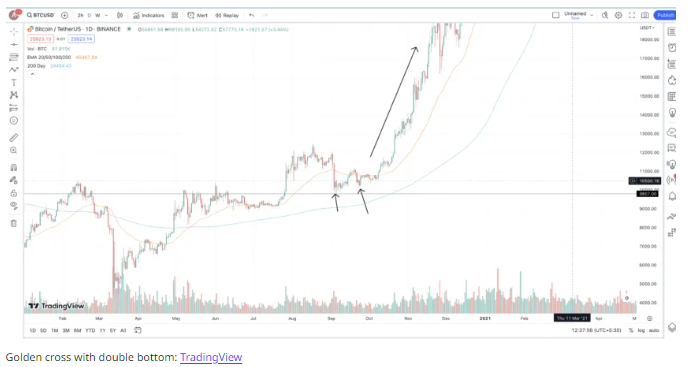 - 골든크로스를 확인했다면 가격과 50일 지수이동평균(EMA)을 주시하세요. 코인 가격이 50일 EMA 선까지 떨어졌다가 반등하는지 확인하세요. 이는 보유 자산을 더 추가하라는 신호일 수 있습니다.