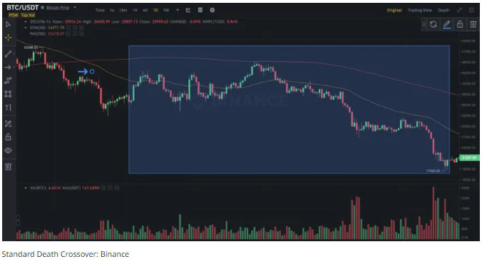 - 또한 50일 EMA가 200일 SMA 또는 데스 크로스오버 아래에서 교차하는 경우, 첫 번째 교차 지점이 종료하기에 좋은 지점이 될 수 있습니다. 데스 크로스에서는 ‘떨어지는 칼‘ 또는 급격한 가격 조정이 예상이 됩니다.