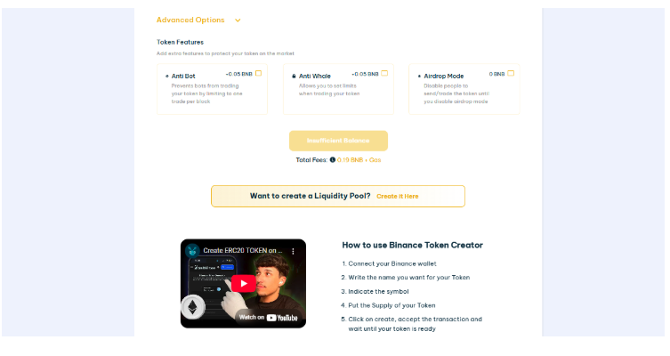 이러한 기능을 선택하려면 BNB 0.05 개가 추가로 필요합니다. 기본 토큰 발행에는 최소 BNB 0.19개가 필요합니다.