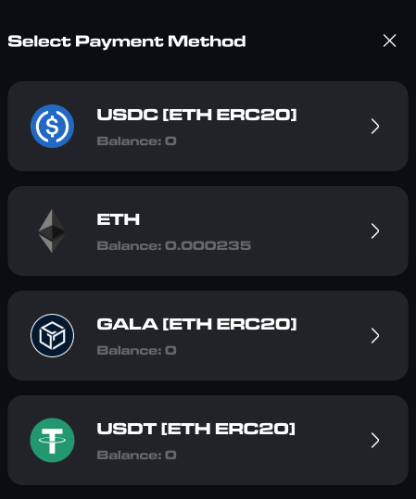 지갑에 충분한 자금이 없으면 구매가 실패하고 “잔액이 부족합니다(Insufficient Balance)”라는 오류 메시지가 표시됩니다. 이런 일이 발생하면, 필요한 금액(USDC, USDT, 이더리움, GALA ERC-20)을 지갑에 입금하십시오. 자금이 준비되면 구매를 다시 시도하십시오.