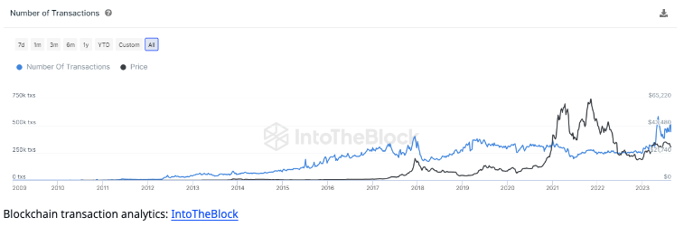 활성 주소와 마찬가지로 트랜잭션 수와 거래량도 네트워크의 활성도를 파악하는 데 도움이 됩니다. 아래 이미지에서 비트코인의 트랜잭션 수를 확인할 수 있습니다. 일반적으로 이 수치가 증가하면 자산이 더 많이 사용되고 있다는 의미이므로 네트워크 성장에 긍정적이라고 말할 수 있습니다.