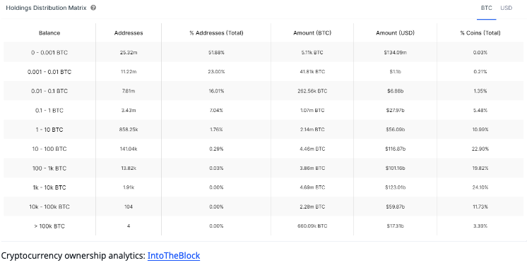 마지막으로 보유자(holder) 구성을 고려하는 것이 좋습니다. 기본적으로 대규모 보유자가 공급량의 많은 부분을 보유하고 있는지, 또는 특정 개인이나 단체가 해당 자산으로 무엇을 하고 있는지 평가해야 합니다. 고래가 자산을 축적하는 것은 좋은 신호일 수 있지만, 소수의 대규모 보유자가 자산의 대부분을 보유하고 있다면 개인 투자자는 이러한 대규모 투자자의 매도 매수 행위에 휘둘릴 수 있습니다. 아래 이미지에서 비트코인 보유자 구성을 확인할 수 있습니다. 또, 몇 개의 주소가 몇 퍼센트의 공급량을 보유하고 있는지 알 수 있습니다.