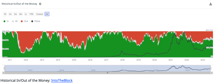 과거에 거래된 ‘자금 유입/유출 지표(IOMAP)’도 살펴볼 수 있습니다. 여기서는 과거 몇 퍼센트의 주소가 손실 또는 이익을 냈는지 확인할 수 있습니다. 현재 수익 보유자 비율이 과거에 비해 매우 높다면, 해당 자산을 구매하기에는 최적의 시기가 아닐 수 있습니다.