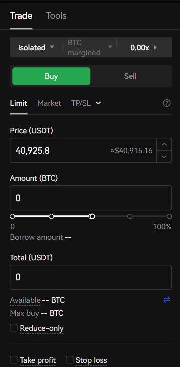 6단계: ‘Limit'(리밋) 과 ‘Market'(시장) 중 주문 유형을 선택할 수 있습니다. 리밋 주문은 내가 설정해놓은 가격이 되었을 때 포지션을 발동시키는 것을 말합니다. 시장 주문은 현재 가격에서 즉시 포지션을 발동시키는 것입니다.