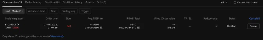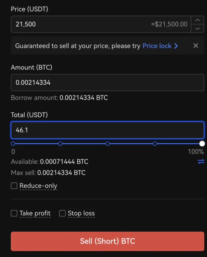 7단계: 확인 후 ‘Sell Short BTC’를 누르면 미결 주문 목록에 예약된 마진 공매도 포지션이 표시됩니다. 이 단계는 실제 주문이 체결된 상태는 아니며, 정해진 가격에 도달해 공매도 포지션이 발동되면 이 목록에서 해당 항목은 지워집니다.