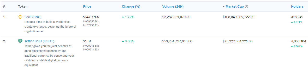 수천 개의 ERC-20 알트코인/토큰 중 하나를 찾고 있다면, 이더스캔이 이 작업에 가장 적합한 도구입니다. 실제로 이 플랫폼을 사용함으로써 이더리움 생태계에 대한 가장 정확한 개요를 얻을 수 있습니다. 이더스캔을 사용하면 토큰의 인기, 보유자 수, 시가총액, 거래량 등을 알 수 있습니다.